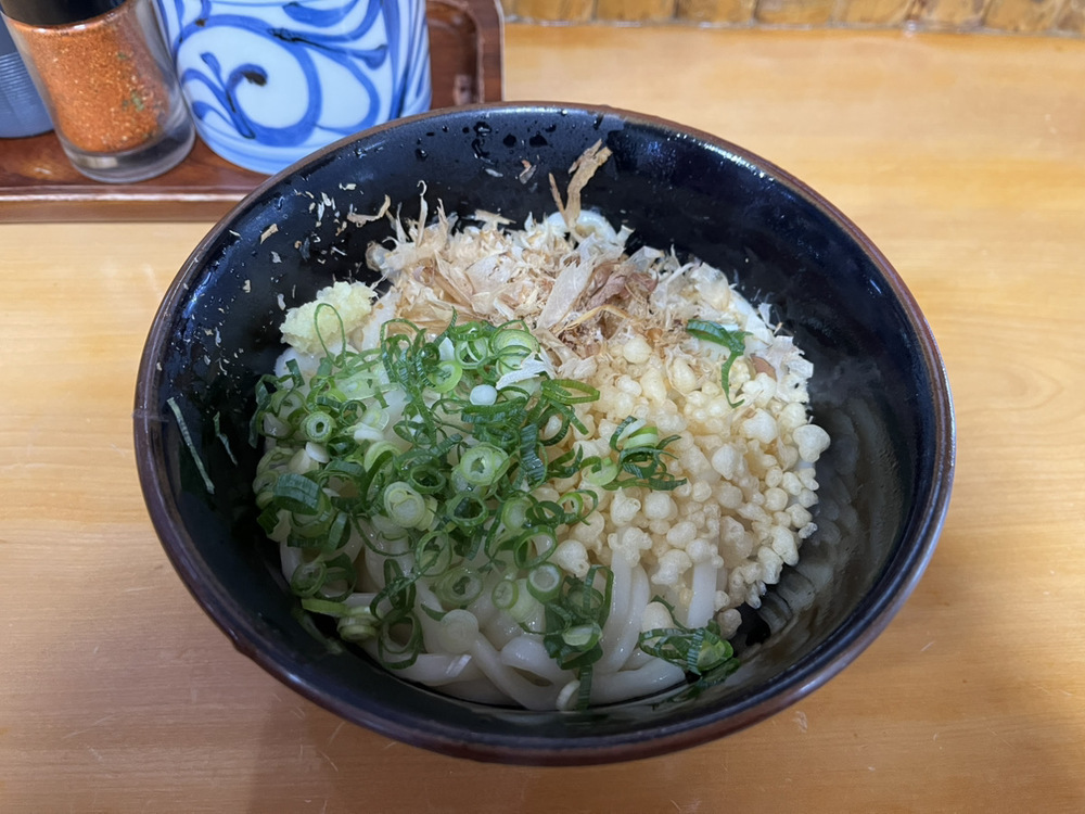 温かい麺のもちもち感に、ネギや天かす、生姜の風味が絡み合い、箸が止まりません。